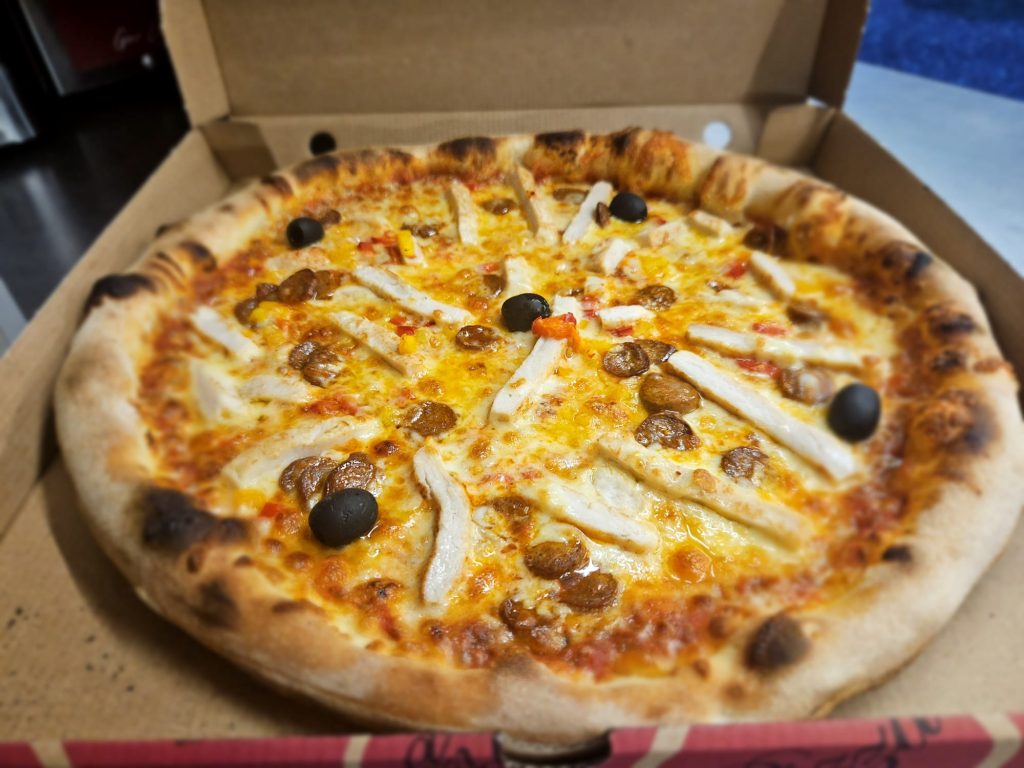tomate, aubergine grillée maison, champignons, fromage, oignons cuisinés maison, poivrons, olives