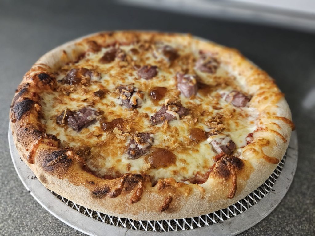 tomate, viande de boeuf, poulet roti, fromage, oignons cuisinés maison, sauce BBQ, oignons frits